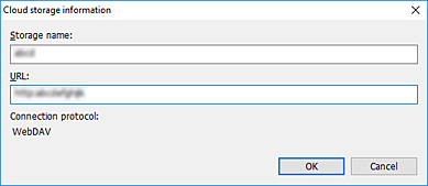 Geben Sie in Speichername (Storage name) den Namen des Cloud-Speichers und in URL die URL für die Verbindung zu WebDAV ein und klicken Sie dann auf OK.