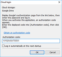 Enter the login ID and password for the cloud service account displayed in Cloud storage, and then click OK.