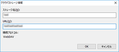 [ストレージ名]にクラウドストレージ名、[URL]にWebDAV接続用のURLを入力し、[OK]をクリックする