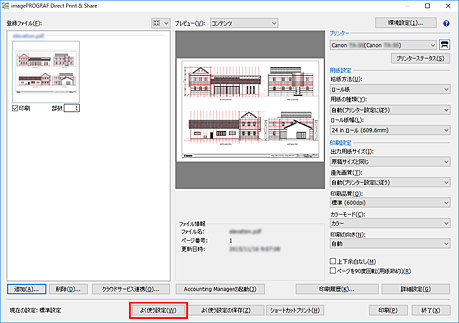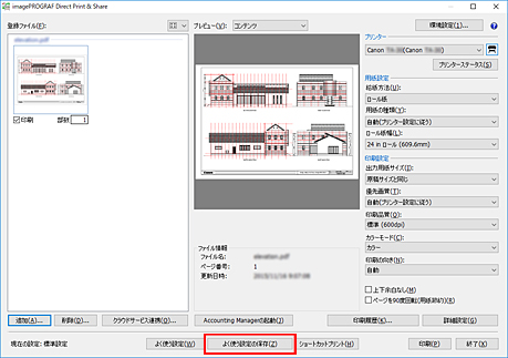 - ファイル形式がtiff/jpeg/PDFとHP-GL/2とではよく使う設定の保存項目が異なるため、保存時と異なるファイル形式へ印刷する場合は、よく使う設定に反映できません。