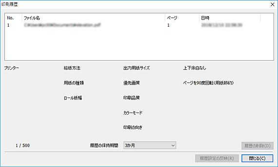過去に印刷したファイルパスと印刷日時がリストで表示されます。リストを選ぶと、ダイアログボックスの下部に使用したプリンターや印刷設定などが表示されます。