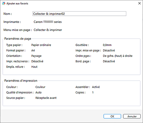 Dans la boîte de dialogue Ajouter aux favoris, vous pouvez modifier uniquement Nom. Si vous souhaitez modifier les paramètres enregistrés, cliquez sur Annuler pour revenir au menu de mise en page. Après avoir modifié les paramètres dans l'écran de modification et dans l'écran des paramètres d'impression, ouvrez de nouveau la boîte de dialogue Ajouter aux favoris.