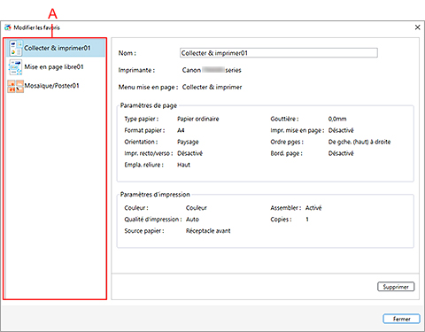 Vous pouvez enregistrer une combinaison constituée d'une imprimante à utiliser, d'un menu de mise en page et de paramètres dans le menu de mise en page, et l'enregistrer dans Favoris.