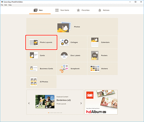 Valitse Uusi (New)-näytössä Valokuva-asettelut (Photo Layouts).