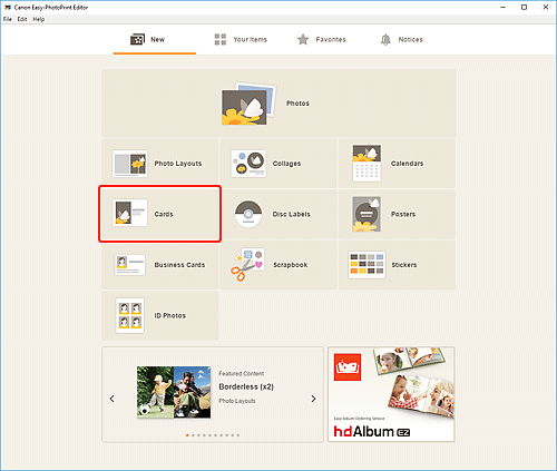 Valitse Uusi (New)-näytössä Kortit (Cards).
