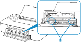 - Вся ли бумага извлечена из левой и правой пустых областей (B) в принтере?