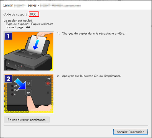Si une erreur se produit pendant l'impression, par exemple lorsque l'imprimante vient à manquer de papier ou en cas de bourrage papier, le voyant Alarme (Alarm) et/ou le voyant MARCHE (ON) de l'imprimante clignotent et un message de dépannage s'affiche sur l'écran de l'ordinateur.