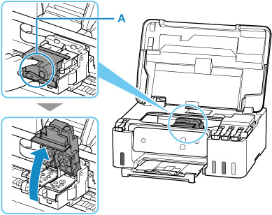 Хванете копчето (A) на застопоряващия капак на печатащата глава, за да го отворите.