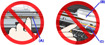 Raak de transparante film (A), de witte band (B) of de slangetjes (C) niet aan.
