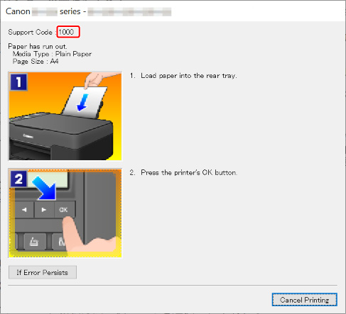 Če med tiskanjem pride do napake, na primer če zmanjka papirja ali se zagozdi, se samodejno prikaže sporočilo o odpravljanju težav. Za nekatere napake je prikazana tudi koda za podporo (številka napake).