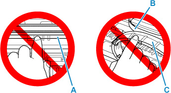 När du tar bort ett hinder för att hållaren för skrivhuvudet ska kunna röra sig fritt ska du vara försiktig så att du inte vidrör den transparenta filmen (A), det vita bandet (B) eller rören (C).