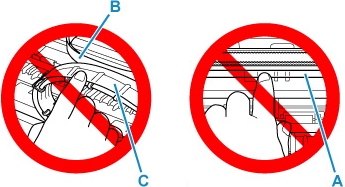 عند إزالة أي عائق لحركة حامل رأس الطباعة، احرص على عدم لمس الفيلم الشفاف (A) أو السير الأبيض (B) أو الأنابيب (C).