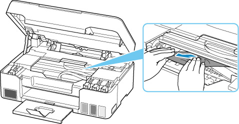 Om papperet som har fastnat rivs sönder och du inte kan ta bort det från pappersutmatningsfacket eller från matningsfacket eller om papperet sitter kvar i skrivaren tar du bort papperet genom att följa anvisningarna nedan.