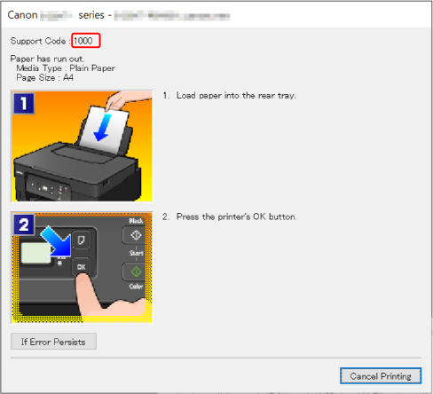 Als er een fout optreedt tijdens het afdrukken, bijvoorbeeld als het papier op is of is vastgelopen, wordt een probleemoplossingsbericht automatisch op de computer weergegeven. Voor sommige fouten wordt ook een ondersteuningscode (foutnummer) weergegeven.