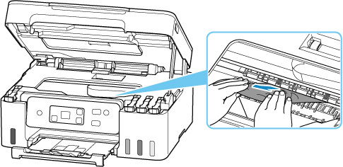 Merk- Hvis 1300-feilen (feilkode E03) oppstår igjen, kontrollerer du matingssporet i bakskuffen på nytt. Hvis det er en fremmed gjenstand inne i bakskuffen, kan du se Kontroll1 i Hva skal du gjøre hvis papiret ikke mates / mates ut som normalt, og gjør det som er nødvendig for å rette opp problemet.