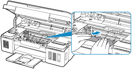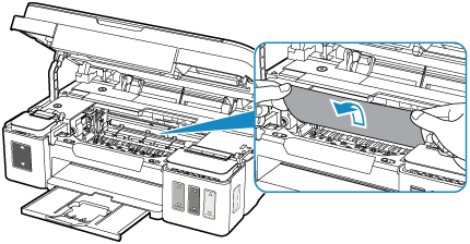 Om papperet som har fastnat rivs sönder och du inte kan ta bort det från pappersutmatningsfacket eller från det bakre facket eller om papperet sitter kvar i skrivaren tar du bort papperet genom att följa anvisningarna nedan.