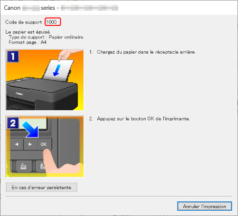 Si une erreur se produit lors de l'impression, par exemple si le papier est épuisé ou coincé, un message de dépannage s'affiche automatiquement. Pour certaines erreurs, un code de support (numéro de l'erreur) s'affiche également.