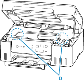 - Any paper left in the left and right empty spaces (D) in the printer?