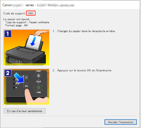 Pour plus d'informations sur la résolution des erreurs avec les codes de support, reportez-vous à la section Liste des codes de support d'erreur d'Imprimante.