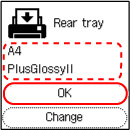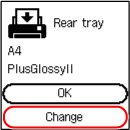 na tiskalniku izberite Spremeni (Change) in pritisnite gumb OK, nato pravilno registrirajte informacije o papirju (velikost papirja in vrsta medija) za papir, naložen v zadnji pladenj, v tiskalnik.
