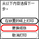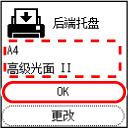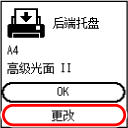 按钮选择更改并按OK按钮,然后将后端托盘中装入纸张的纸张信息(纸张尺寸和介质类型)正确注册到打印机。
