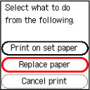 2. Välj Byt papper (Replace paper) med skrivarens uppned-knappar och tryck på OK-knappen.