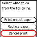 2. Välj Avbryt utskr (Cancel print) med skrivarens uppned-knappar och tryck på OK-knappen.