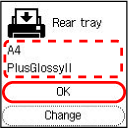 Välj Byt (Change) med skrivarens uppned-knappar och tryck på OK-knappen. Registrera därefter pappersinformationen (pappersstorlek och medietyp) för det papper som har fyllts på i det bakre facketskrivaren.
