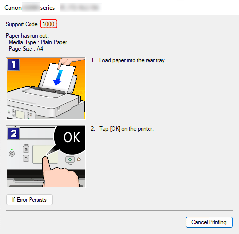 Se si verifica un errore durante la stampa, ad esempio se la carta si esaurisce o si inceppa, viene visualizzato automaticamente un messaggio per la risoluzione dei problemi. Per alcuni errori viene visualizzato anche un codice supporto (numero di errore).