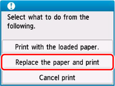 Selecteer Vervang het papier en druk af (Replace the paper and print).