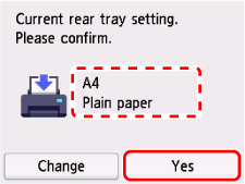 Controleer de papierinformatie (papierformaat en mediumtype) en selecteer Ja (Yes).