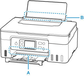 Controle 3 Zitten er vreemde voorwerpen in de invoersleuf of de achterste lade (B)?