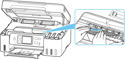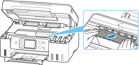Als het papier scheurt wanneer u het naar buiten trekt, kan er wat papier in de printer blijven zitten. Controleer het volgende en verwijder eventueel achtergebleven papier uit de printer.