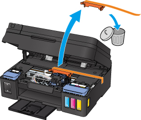 Open de scaneenheid/klep en controleer of het beschermende materiaal en de tape zijn verwijderd van de cartridgehouder.