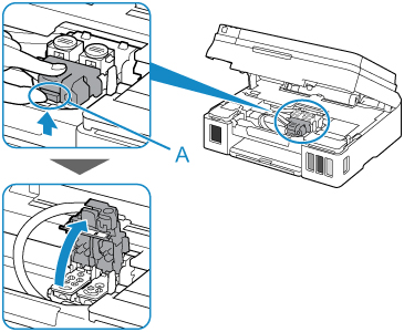 Paėmę už kasetės fiksavimo dangtelio rankenos (A) jį atidarykite.