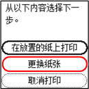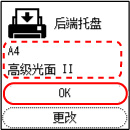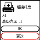 按钮选择更改并按OK按钮,然后将后端托盘中装入纸张的纸张信息(纸张尺寸和介质类型)正确注册到打印机。
