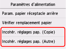 Sélectionnez Incohér. réglages pap. (Copie) ou Incohér. réglages pap. (Autre).