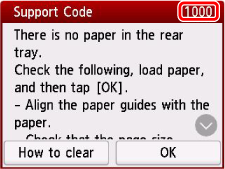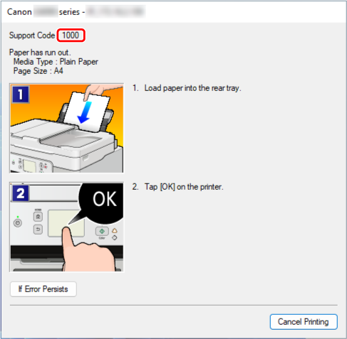 Jika terjadi kesalahan sewaktu mencetak, misalnya jika kertas habis atau macet, pesan penyelesaian masalah akan ditampilkan secara otomatis. Untuk beberapa kesalahan, kode dukungan (nomor kesalahan) juga ditampilkan.