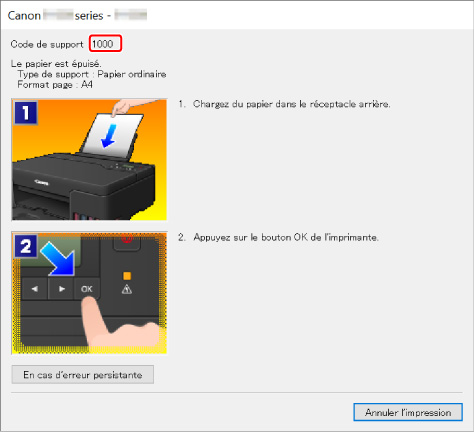 Si une erreur se produit lors de l'impression, par exemple si le papier est épuisé ou coincé, un message de dépannage s'affiche automatiquement. Pour certaines erreurs, un code de support (numéro de l'erreur) s'affiche également.