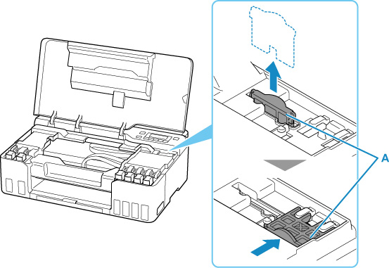 Deschideţi capacul superior şi trageţi opritorul carului (A) drept în sus.