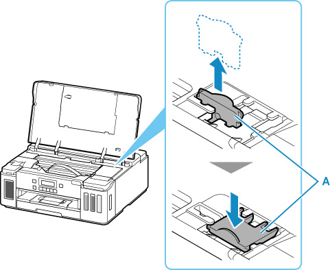 Ανοίξτε το επάνω κάλυμμα και τραβήξτε ευθεία προς τα έξω το στοπ φορείου (A).