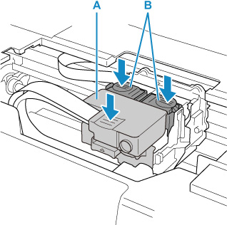 Отворете сканиращия модул/капака и след това натиснете силно застопоряващия капак на печатащата глава (A).