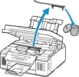Otwórz moduł skanera/pokrywę i upewnij się, że materiał ochronny i taśma zostały zdjęte z uchwytu głowicy drukującej.
