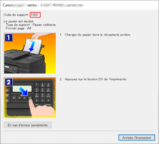 Lorsqu'une erreur se produit, un message s'affiche sur l'ordinateur ou sur l'imprimante. Pour certaines erreurs, un code de support (numéro de l'erreur) s'affiche également.