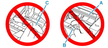 لا تقم بلمس الفيلم الشفاف (A) أو السير الأبيض (B) أو الأنابيب (C).
