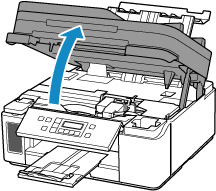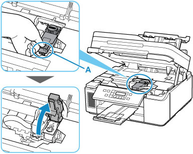 Prindeţi cu mâna butonul (A) de pe capacul de blocare a capului de imprimare, pentru a-l deschide.