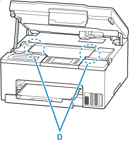 - Vai ierīces kreisajās un labajās tukšajās vietās (D) printerī nav palicis papīrs?