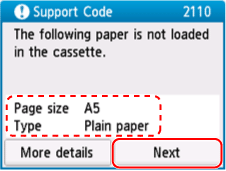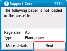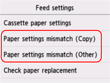 Selectaţi Nepotriv. setări hârtie (Copiere) (Paper settings mismatch (Copy)) sau Nepotriv. setări hârtie (Altele) (Paper settings mismatch (Other)).
