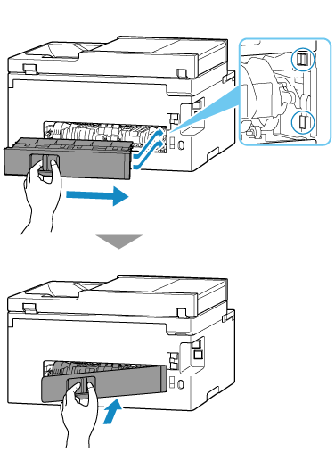 Introduceţi proeminenţele din partea dreaptă a capacului din spate în imprimantă, apoi împingeţi partea stângă a capacului din spate până când se închide complet.