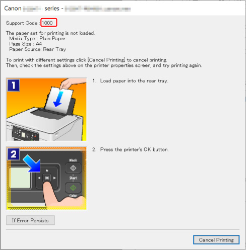Kui printimisel tekib tõrge (nt paber on printerist otsa saanud või tekkinud on paberiummistus), kuvatakse automaatselt vastav tõrketeade. Mõne tõrke puhul kuvatakse ka tugikood (tõrke number).
